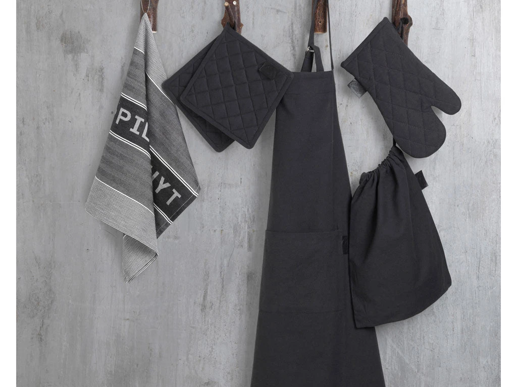 Sæt med viskestykker, grydelapper, grillhandske og forklæde.
