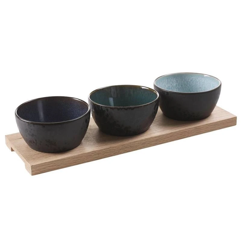 Bitz cabaretsæt indeholder 1 træbakke og 3 skåle.Skålene er fremstillet i robust stentøj, og den flotte, reaktive glasur fremhæver stentøjets glød. Kombinationen af skålenes udvendige, matte glasur og de 3 forskellige blanke glasurer på indvendig side, giver et unikt og spændende udtryk, og du finder ikke to skåle, der er helt ens. Skålene tåler maskinopvask, mikroovn, fryser ned til minus 18 grader og ovn op til 250 grader. Skålener er 12 cm i diameter. Træbakken er fremstillet i ubehandlet eg, der med tiden vil blive mørkere.Bakken rengøres ved håndopvask med varmt vand og mild sæbe. Bakken kan vedligeholdes med madolie.
