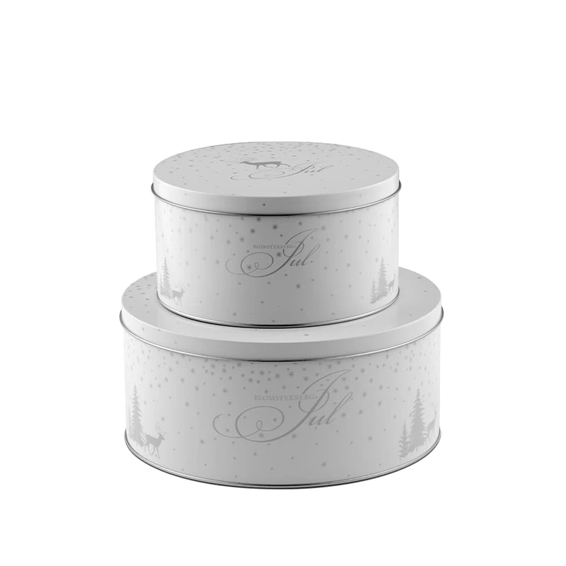 Dette fine kagedåsesæt fra Mette Blomsterberg består af en stor dåse på Ø22 cm. med en højde på 10 cm. og en lille kagedåse, der måler Ø17 cm med en højde på 9 cm. To helt perfekte størrelser til opbevaring af julens hjemmelavede eller købte småkager, slik, kiks eller hvad der end skal holdes styr på. Hver opmærksom på at kagedåserne skal vaskes op i hånden med varmt vand og sæbe. Det anbefales også at de vaskes inden første ibrugtagning.