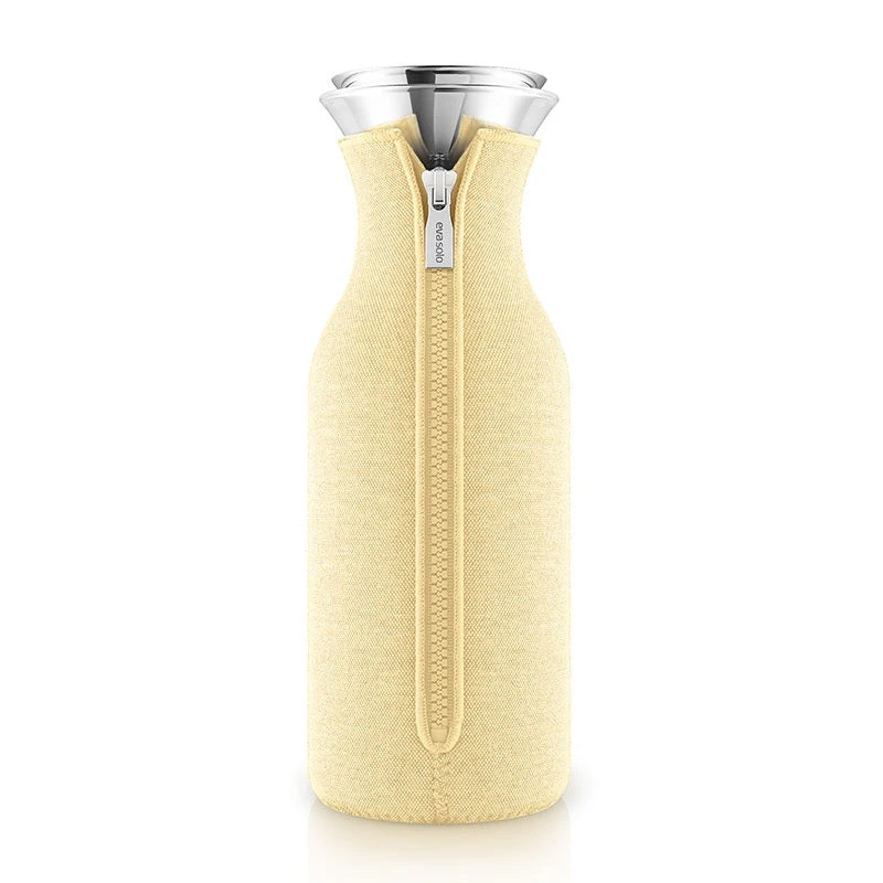 Eva Solo køleskabskaraffel 1,0 literDenne er næsten uundværlig når der skal sørges for fx et dejligt koldt glas vand eller forfriskende juice.Køleskabskaraflen passer i de fleste køleskabslåger. Den er velegnet til såvel kolde som varme drikke.Patenteret hældekant i rustfrit stål og silikone sikrer at karaflen er 100% drypfri.Der medfølger vippelåg der åbner automatisk når der hældes.Dragten sørger for at indholdet holdes tempereret længere og sikrer der ikke kommer kondensringe på bordet.Glas og metaldele tåler maskinopvaskDragten kan vaskes i vaskemaskine ved 30 °C skånevask.Højde 26,5 cmDiameter 9,5 cm