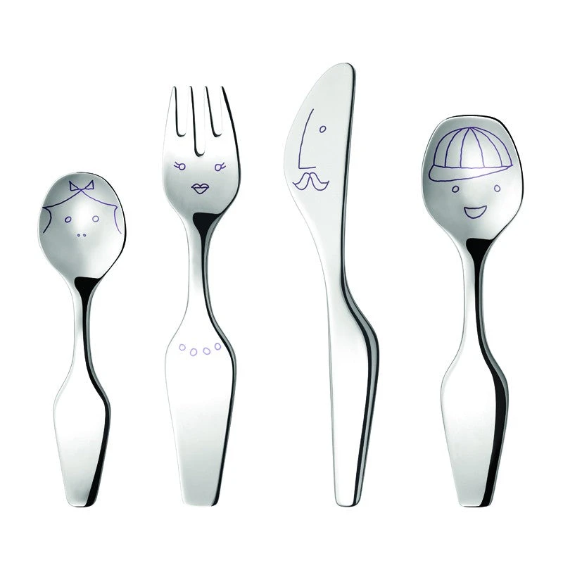 Består af 4 bestik dele. Indeholder børneske, -gaffel, -kniv og -teske. Den består af tegninger af en familie med mor, far, søn og datter.