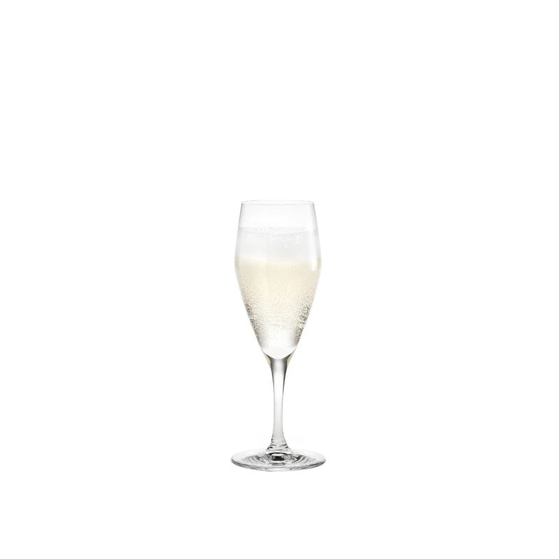 Holmegaard Perfection Champagneglas 23 cl. Champagneglasset har en stor overflade der lader champagnen udvikle dens duft og smagsnuancer. Når champagnen skænkes i glasset så lad de perlende bobler løbe ned langs kanten på glasset.