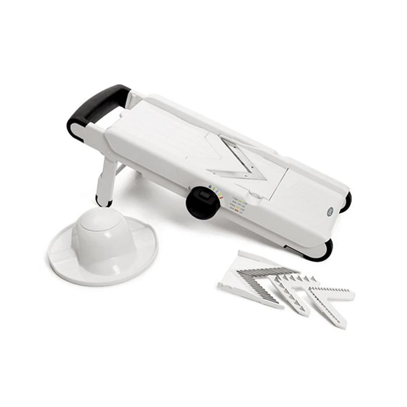 V-Mandolinen skærer både grøntsager og frugt i tykke eller tynde skiver, juliennestrimler, pommes frites eller bølgede skiver. Et skarpt V-formet skæreblad i hærdet rustfrit stål skærer nemt igennem både faste grøntsager og bløde frugter, såsom tomater. Vælg nemt mellem fire tykkelser: 1,5 mm, 3 mm, 4,5 mm og 6 mm. Det bløde gummihåndtag sikrer et godt greb under arbejdet, og ben i blød gummi sikrer, at mandolinjernet står godt fast på underlaget. De forskellige skæreblade har hver sin opbevaringsplads på undersiden af mandolinen. Mandolinens indstilling kan låses, og benene foldes ind for sikker og kompakt opbevaring.