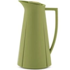 1,0 liter. Med tryk knap. Glas indsats der holder godt på varmen.