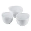 Låg medfølger. 3 skåle i forskellige størrelser – 0,5, 1 og 2 liter. Tåler maskinopvask samt mikroovn.