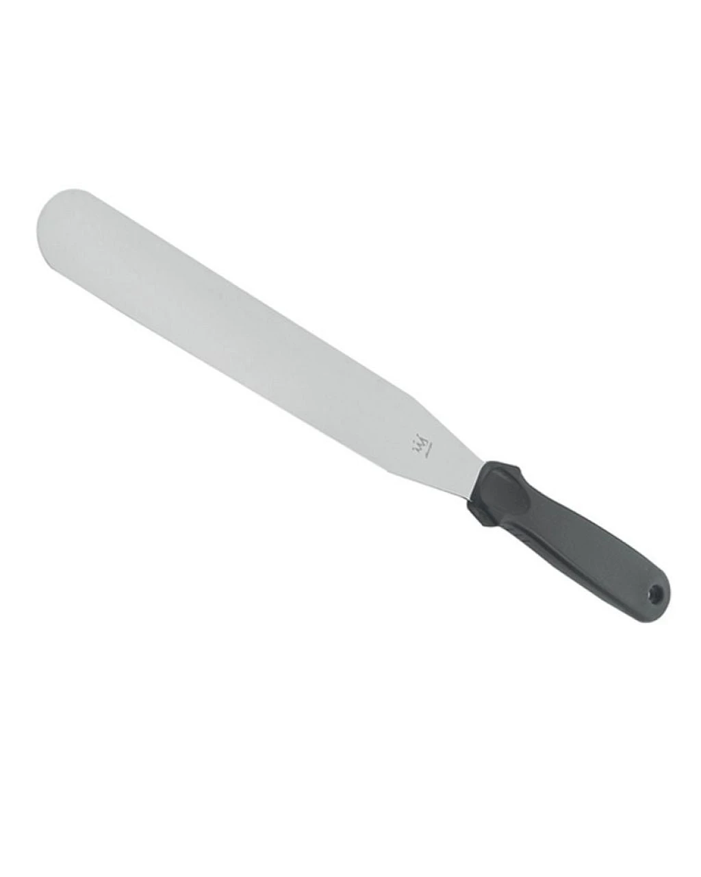 Paletkniv i fleksibel rust frit stål med sort plast håndtag.